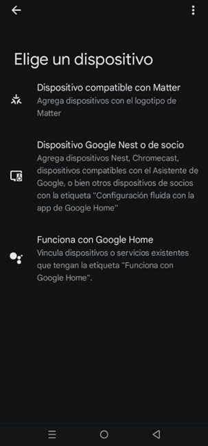 Aparecerá un menú con tres opciones. Selecciona “Dispositivo Google Nest o de socio” y luego elige “Casa” o “Home”.