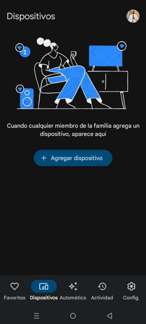 Una vez dentro de la app, dirígete a la sección de dispositivos. Aquí podrás agregar cualquier elemento de tu hogar, incluida tu TV. Para ello, pulsa en “Agregar”.
