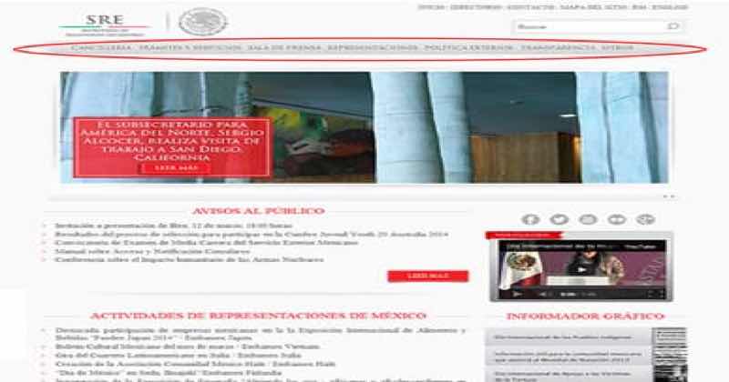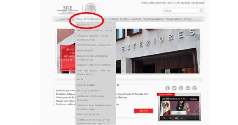 - Entre en el Departamento de Estado (SRE). Una vez dentro, pincha en ‘Trámites y Servicios’ en la parte superior. Aparecerá una lista, seleccione «Pasaporte».