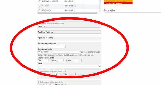 A continuación, deberá registrarse en el sistema del sitio web de la SRE. Para ello, tendrá que hacer clic en el botón verde que dice «Concertar citas en línea». Una vez que se haya registrado, tendrá que introducir sus datos personales. Nombre, apellido, número de teléfono, contraseña y dirección de correo electrónico.